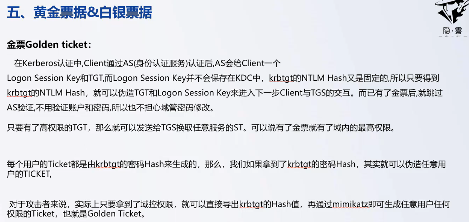 黄金票据伪造的是TGT,白银票据伪造的是ST,黄金票据可以利用整个域内任何一个服务进行权限维持,白银票据只能利用某个服务进行权限维持