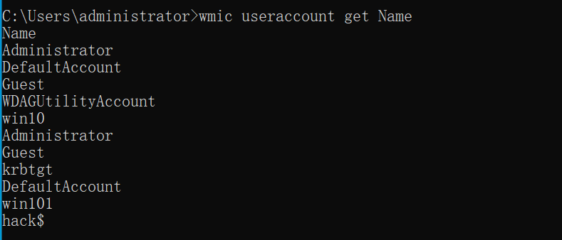 创建完后,通过 net user 和控制面板等等都是看不到这个账号的,但是wmic还是可以查看到隐藏用户