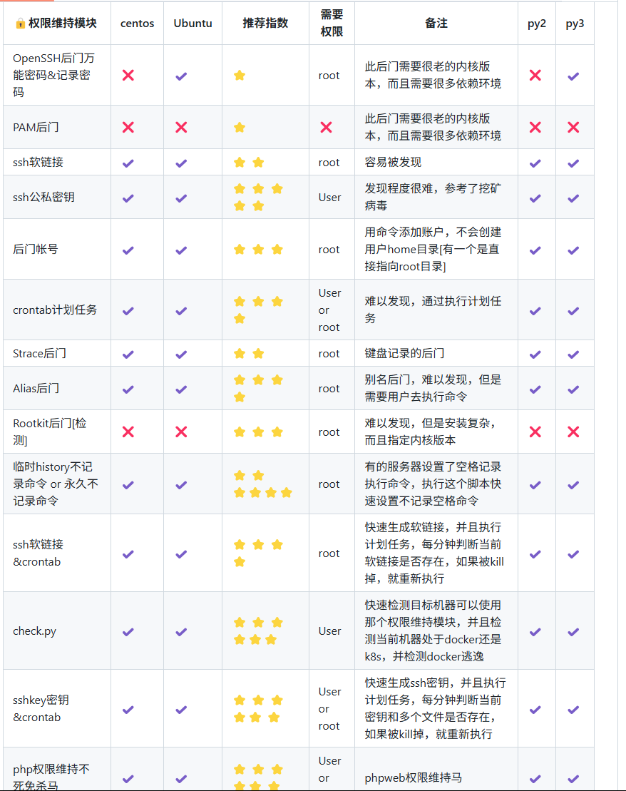 1.添加账号 2.写SSH公私钥 3.定时任务反弹Shell 4.Strace键盘记录后门 5.OpenSSH后门 6.SSH PAM后门 7.SSH 软连接后门 8.Alias别名反弹shell 9.Rookit后门