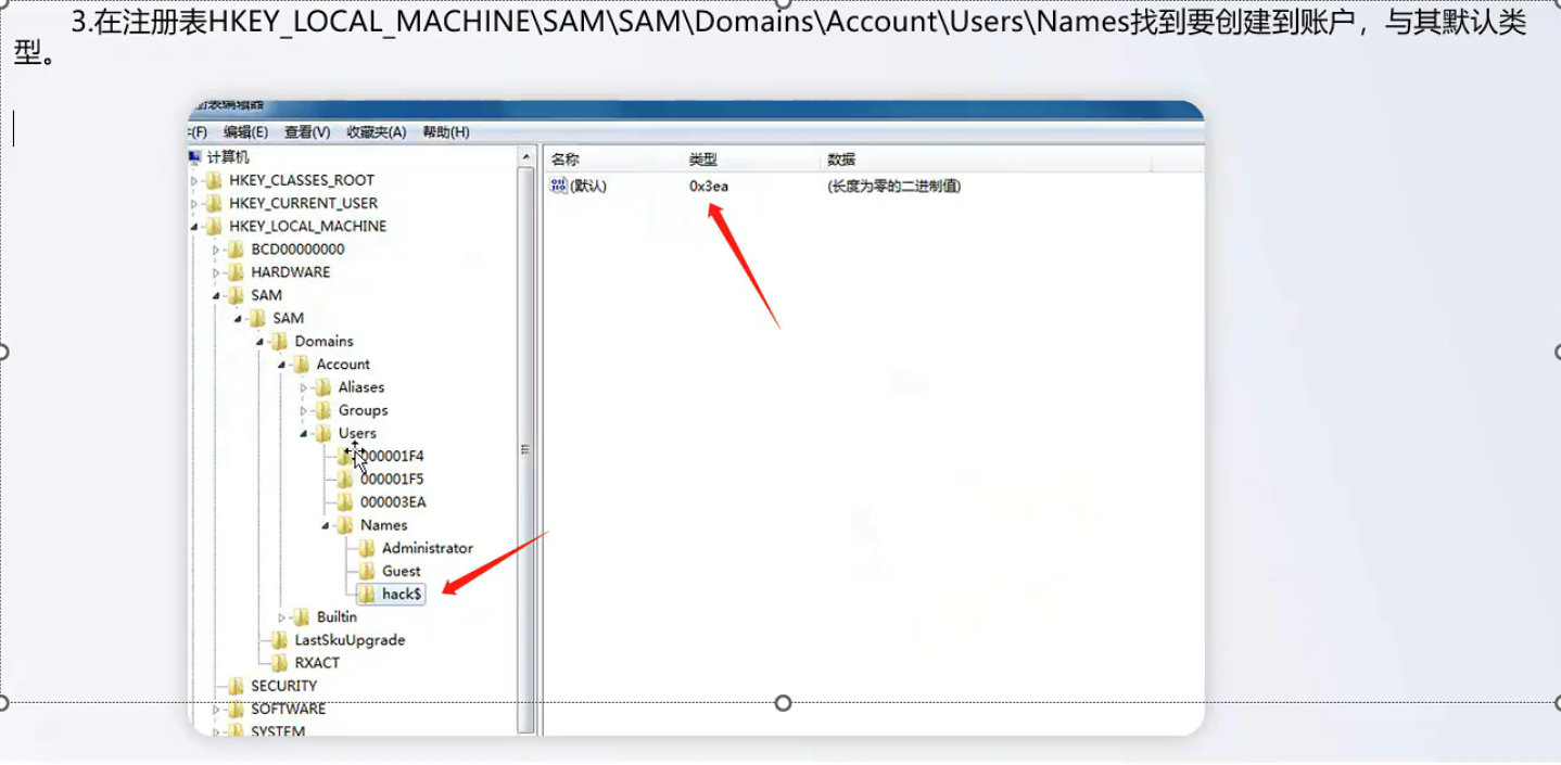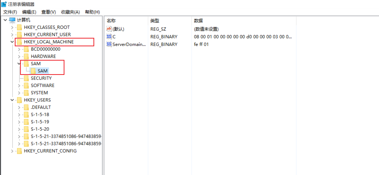 在注册表找到要修改的用户,Win10,Win2016以上账户无法展开注册表中的SAM,Win7以下可以