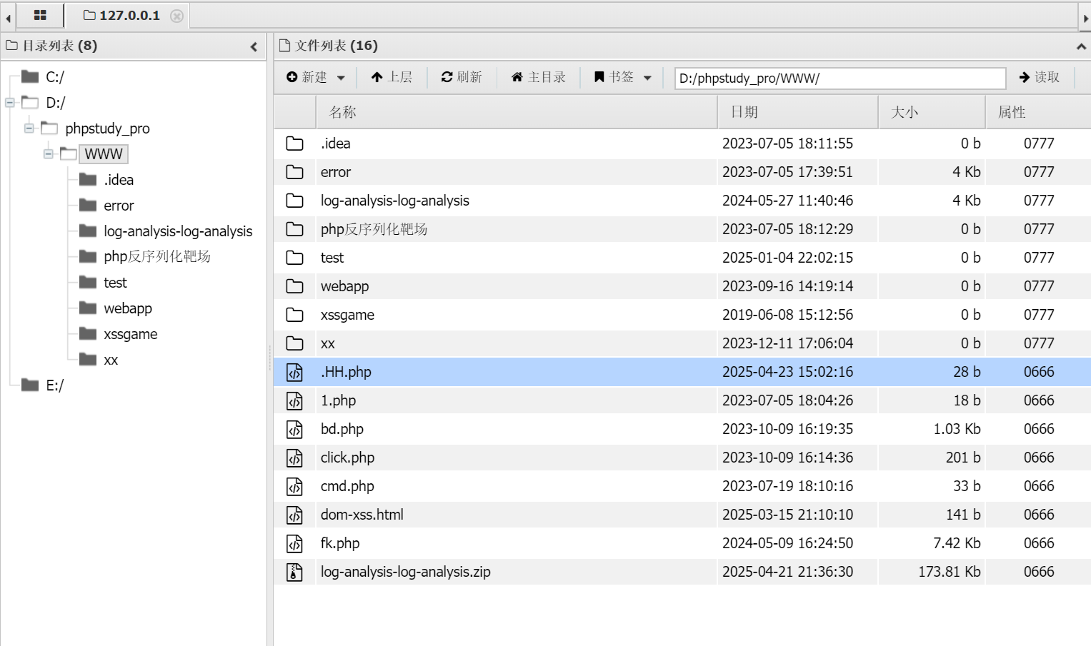 访问这个不死马,会一直转圈圈,此时会生成一个.HH.php隐藏文件,直接连接这个隐藏文件即可,这个不死马会自动删除自己,只要浏览器没有在访问,你也可以直接删除这个文件