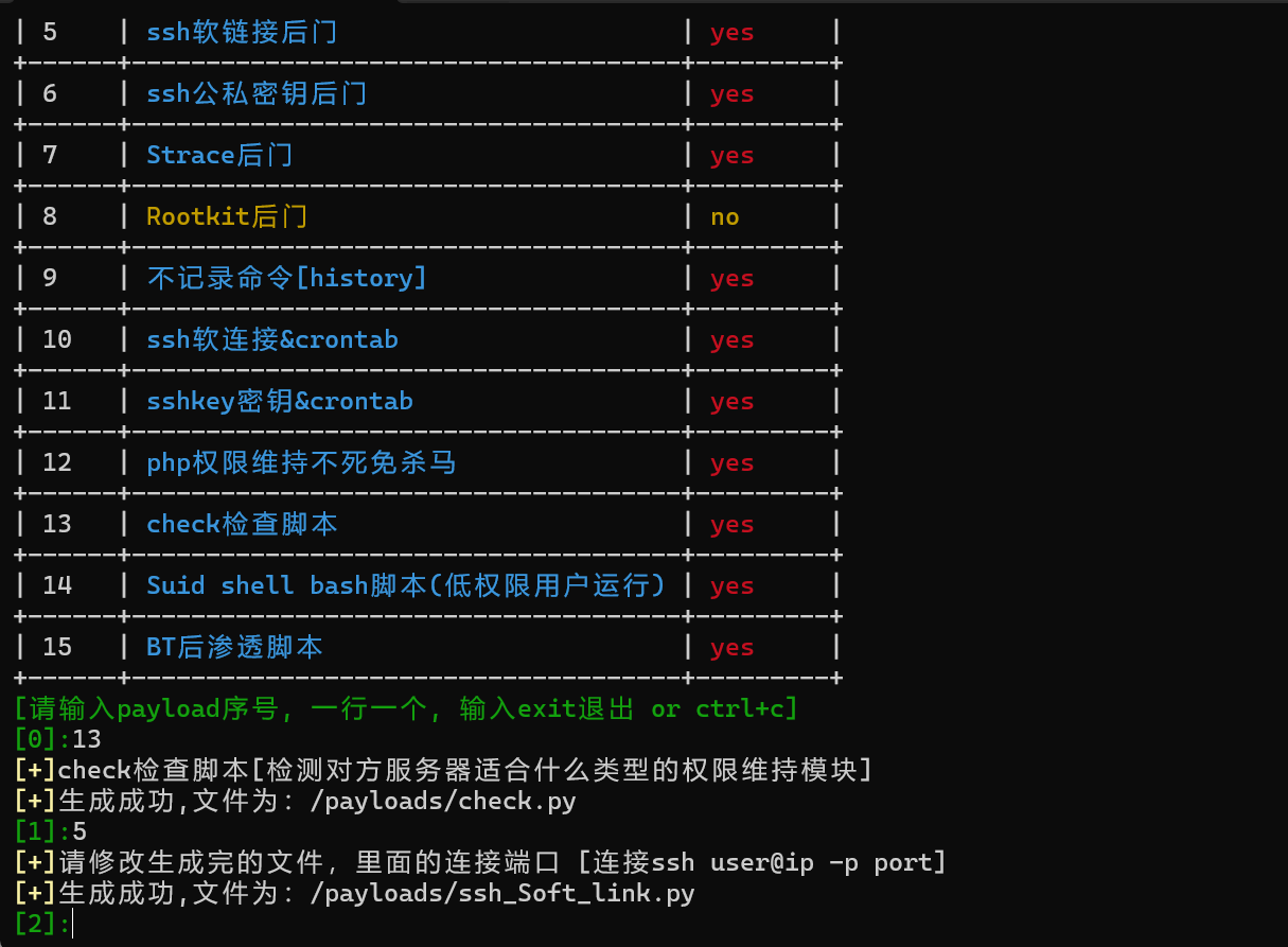 python main.py -m 13 //生成检测脚本,判断服务器适用于哪种方法进行权限维持