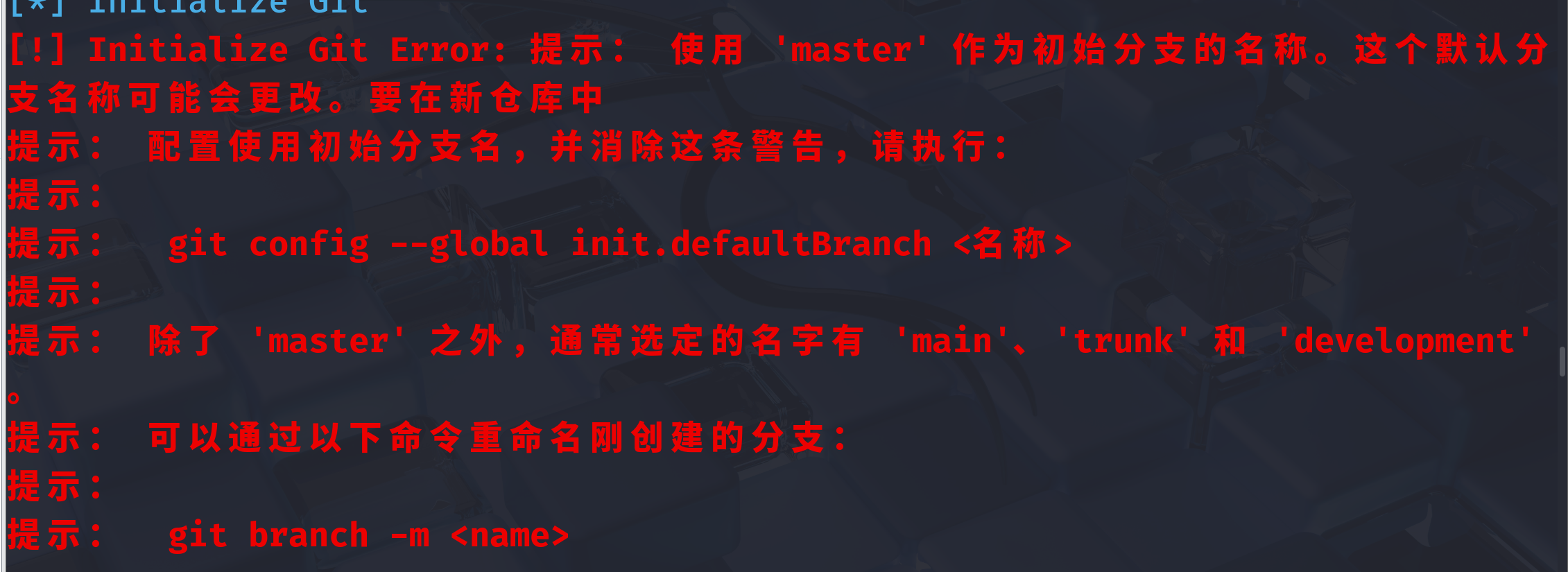 按提示执行这个命令:git config –global init.defaultBranch