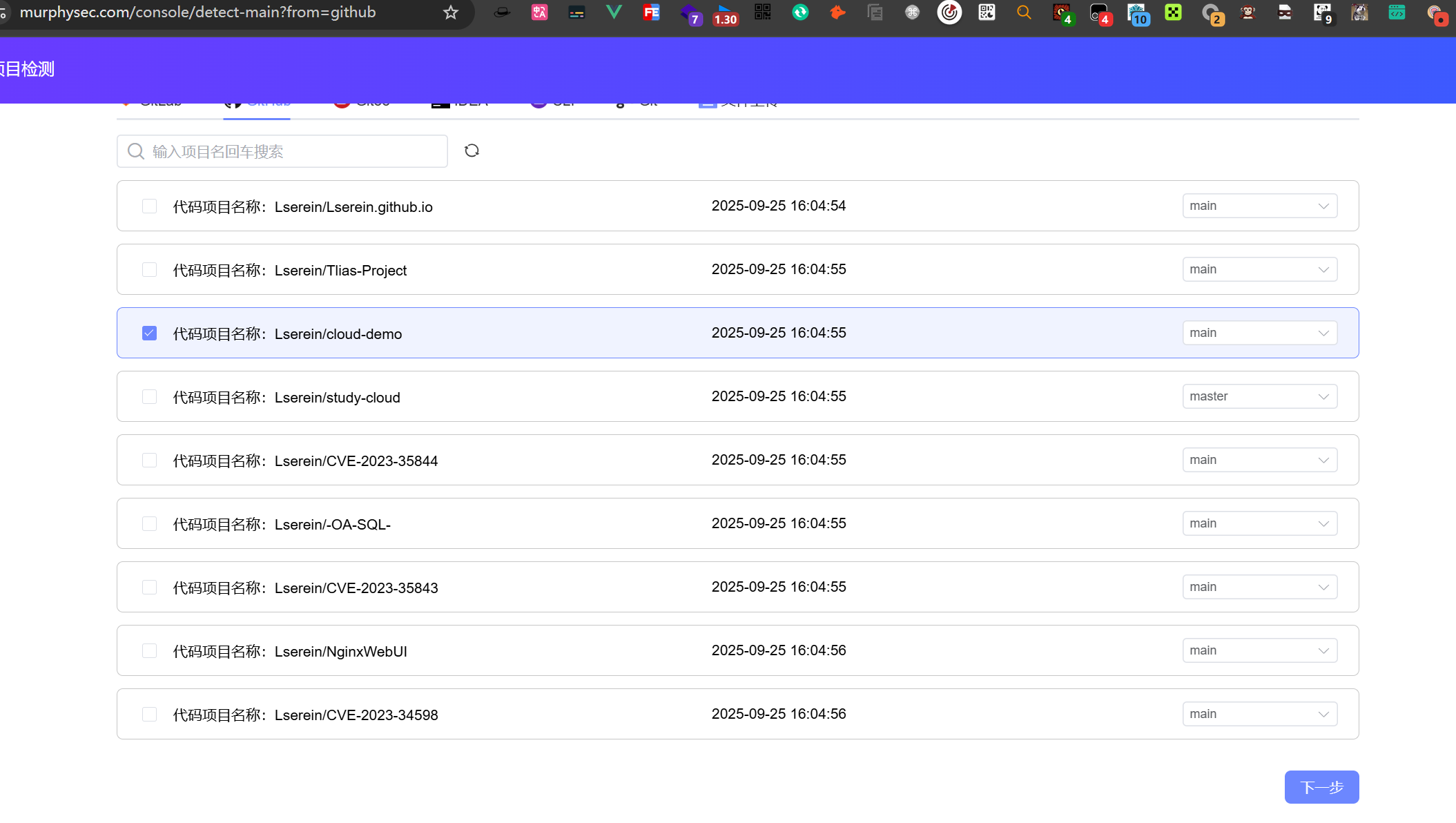 和github绑定后选择对应的项目