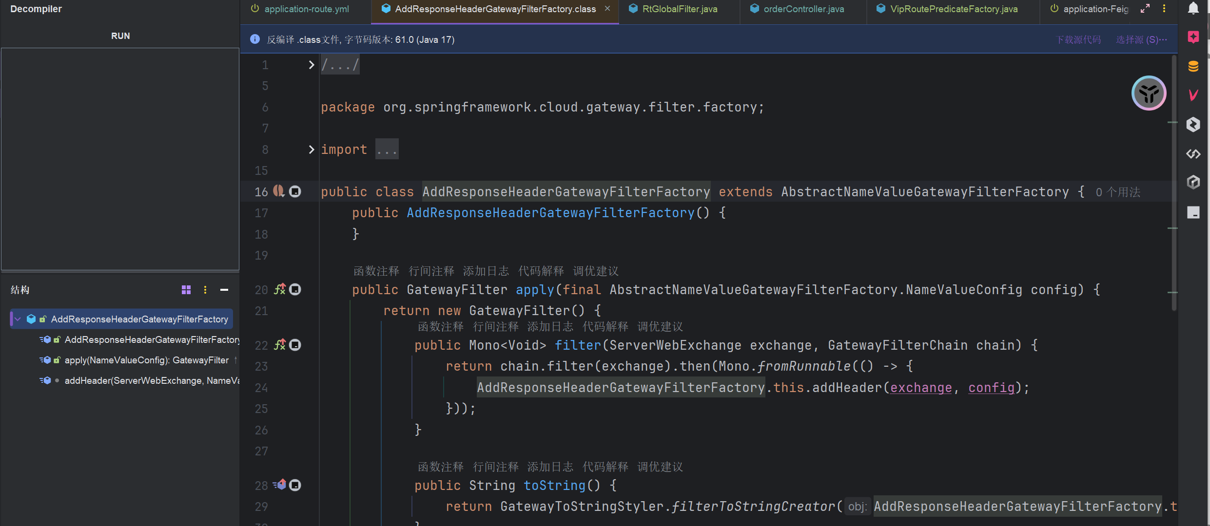 自定义过滤器工厂和自定义断言工厂一样,可以看Spring Cloud自带的过滤器工厂是怎么设置的,根据样式仿写即可