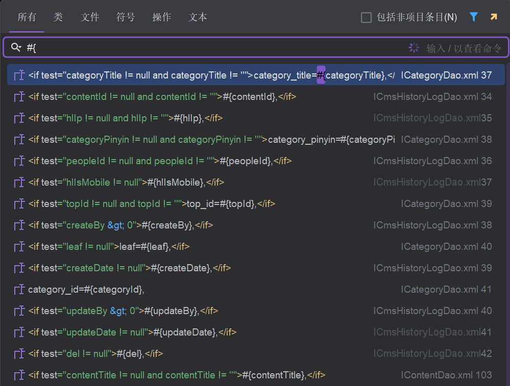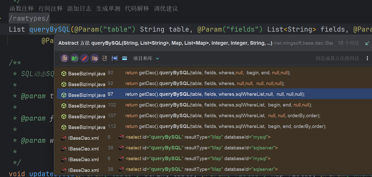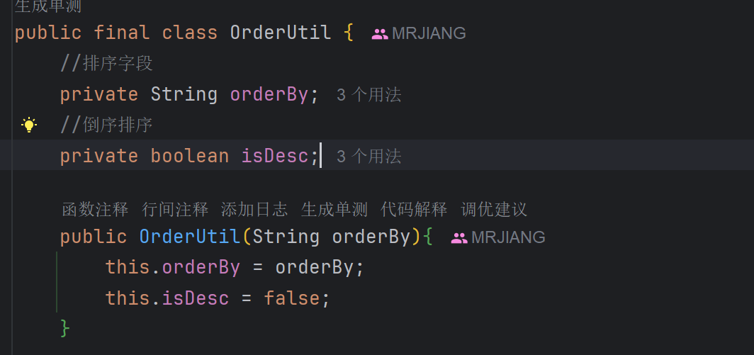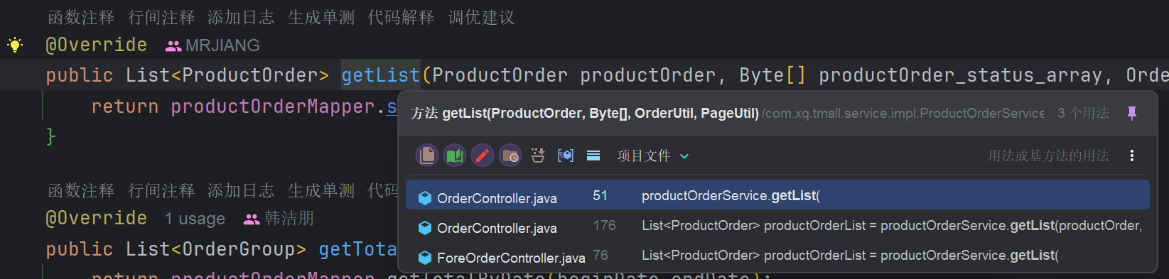 可以看到几个Mapper映射文件中存在${符号,判断变量是否可控,OrderUtil类中有两个属性,表明不是写死的,是可控的,继续跟,看Service层哪些方法调用这个SQL语句,并且传参是否存在Order By关键字
