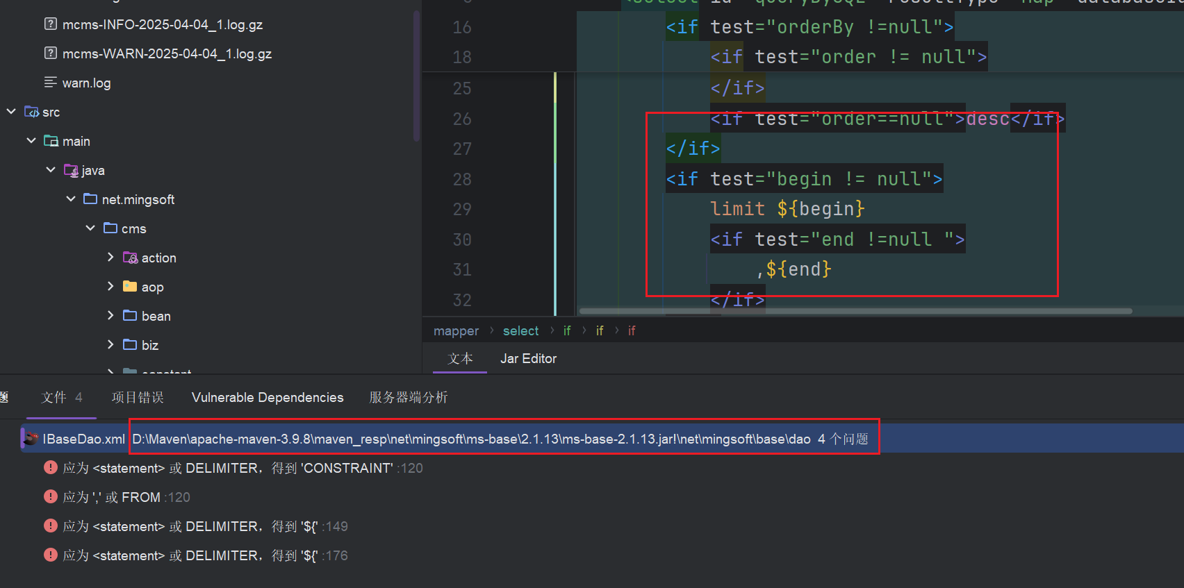 查看pom配置文件查看相关使用依赖,在SQL注入中,Mybatis,Mybatis-plus,Hibernate都需要引入pom依赖,只有JDBC是Java原生的API接口,不需要引入依赖