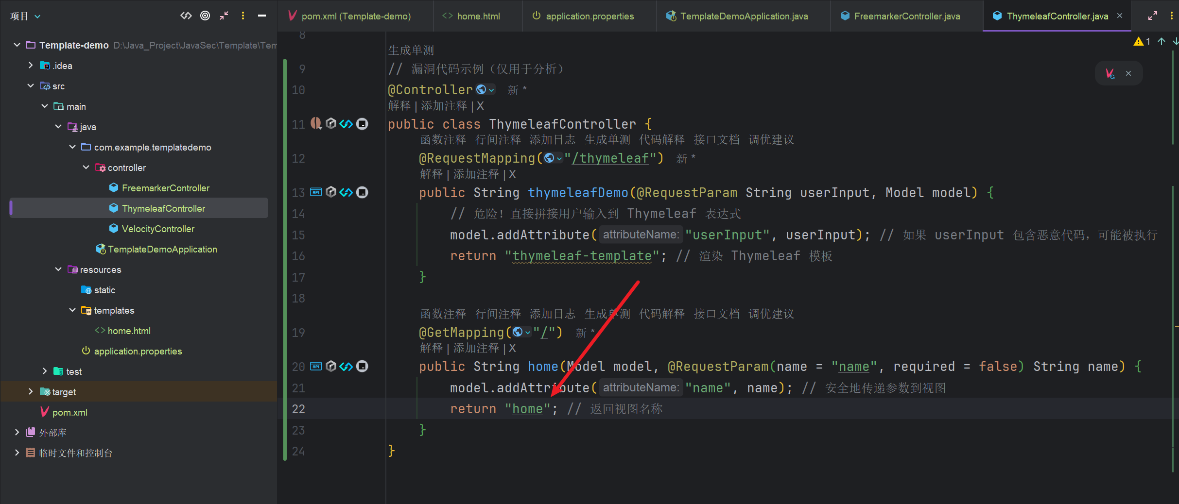 这种情况最容易出现thymeleaf模板注入漏洞,一旦用户提交的数据可以传到return语句中,攻击者就可以提交恶意模板注入语句使thymeleaf组件进行模板解析,造成代码执行漏洞。