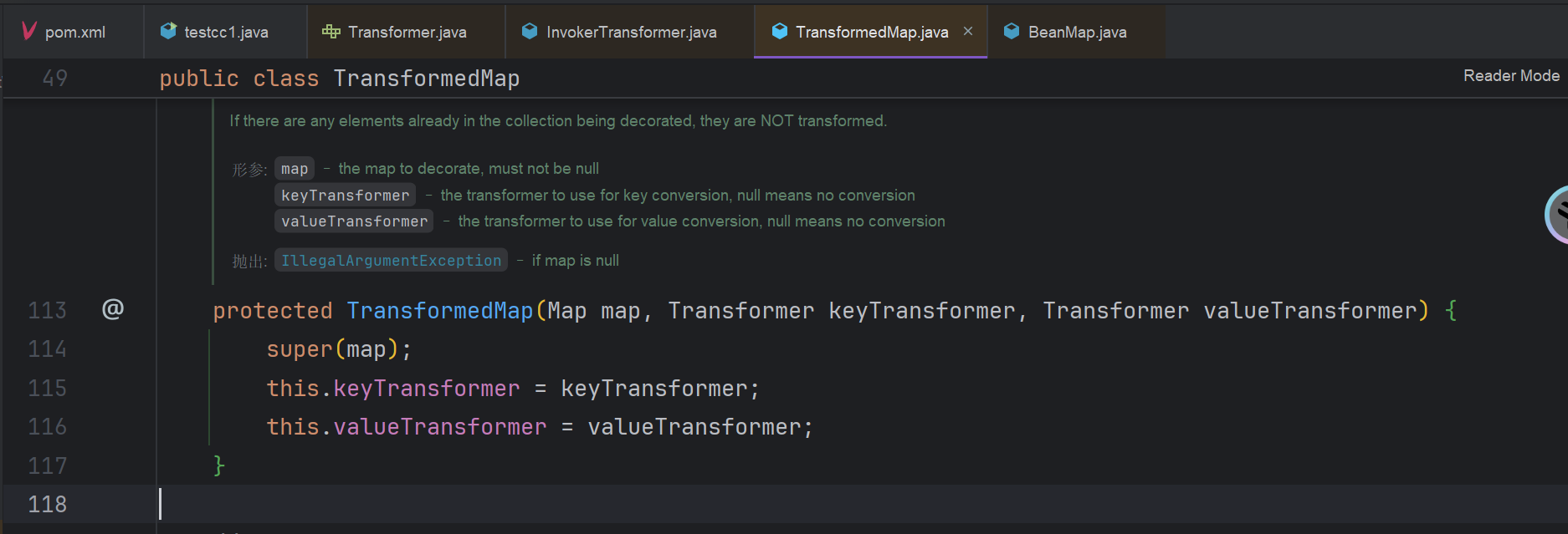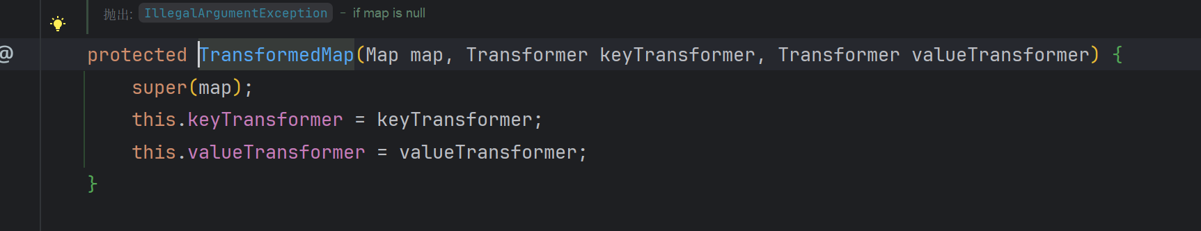 我们发现TransformedMap的构造方法传入**valueTransformer,并给他赋值,但是这个构造方法是protected受保护的,没办法在类的外部调用**