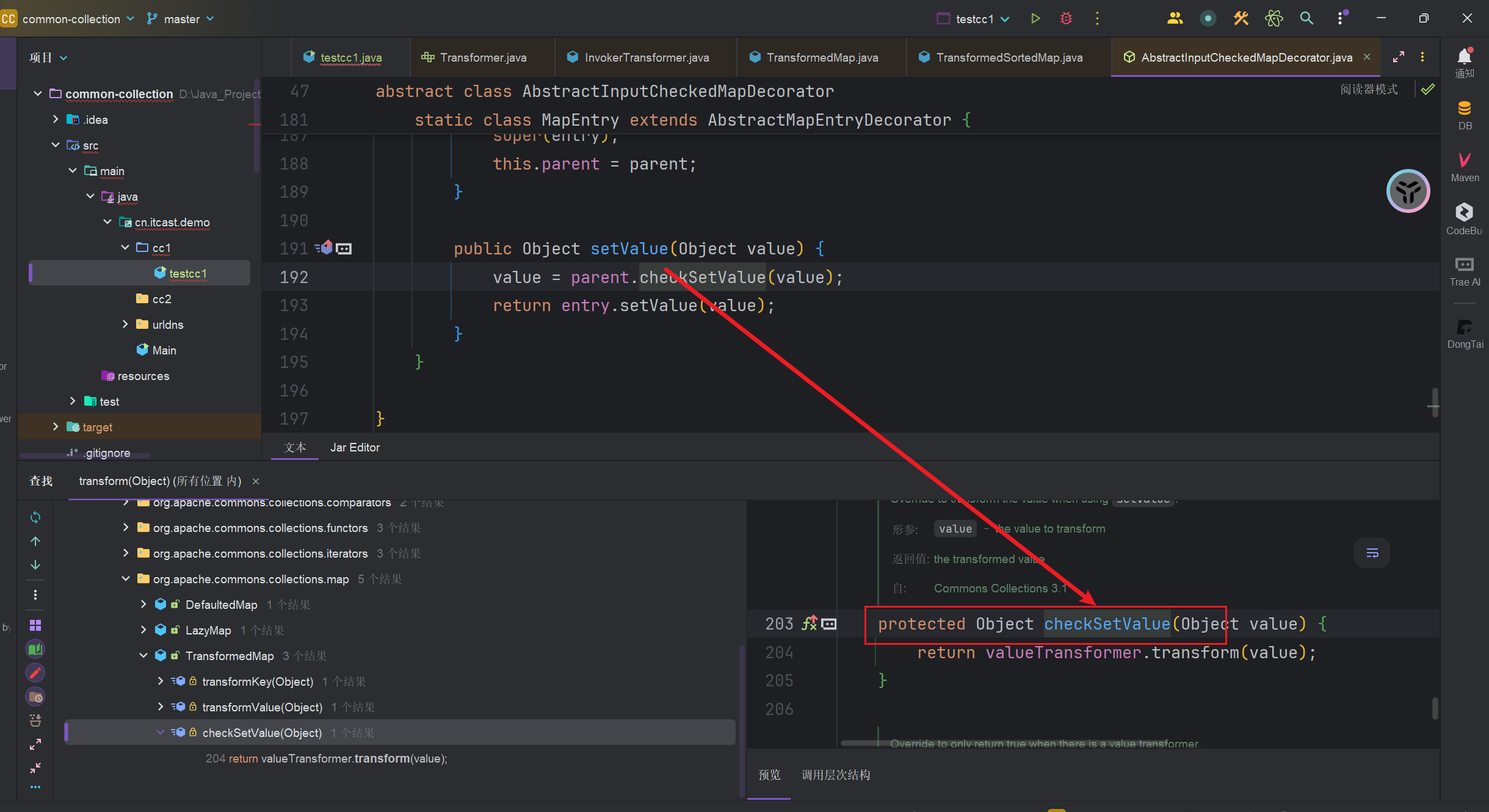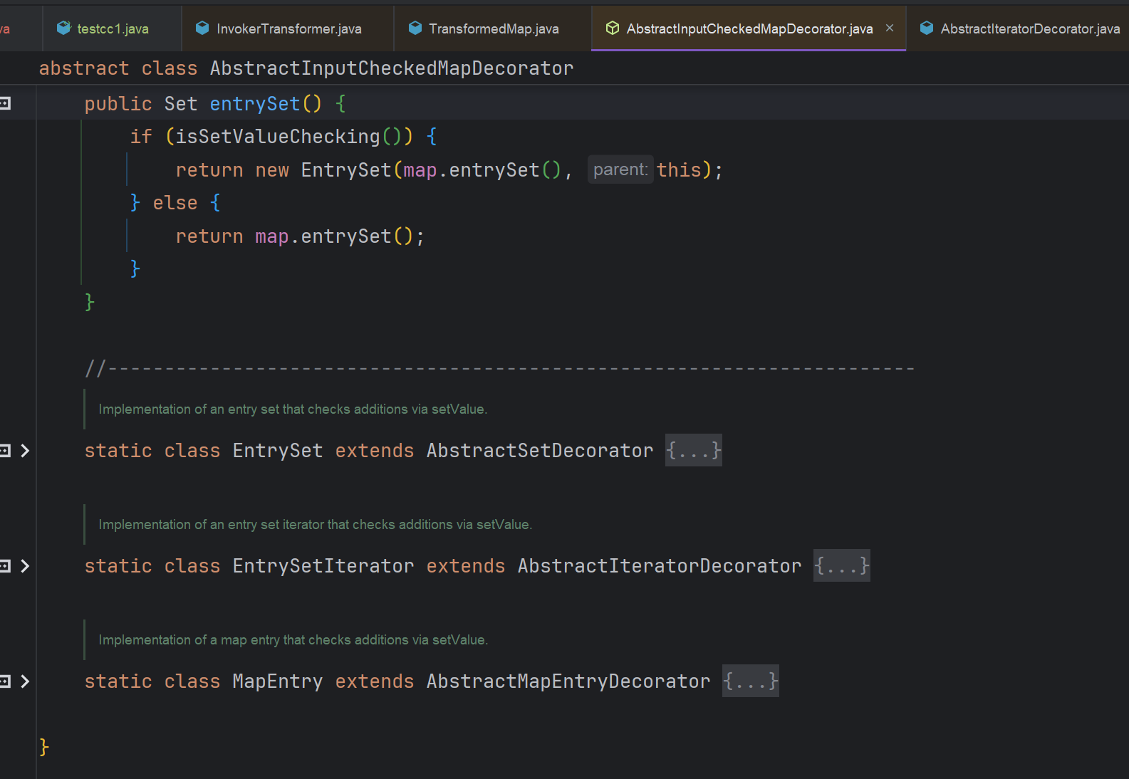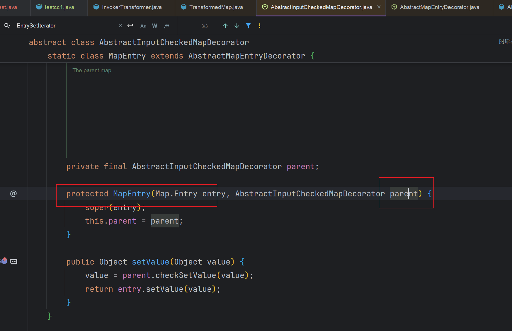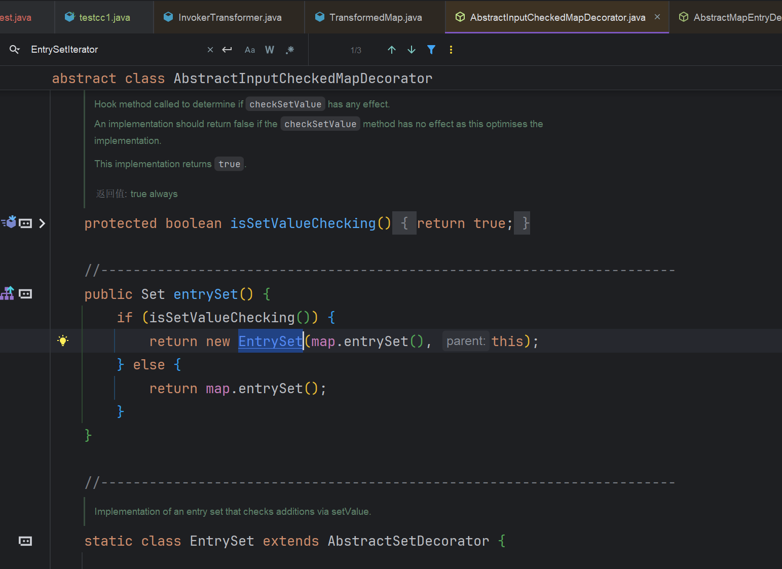 点击方法调用,发现setValue方法调用了checkSetValue()方法,setValue()方法是MapEntry这个类的(MapEntry 是内部静态类,重写了 setValue()),他在AbstractInputCheckedMapDecorator这个类中,而这个类正好是TransformedMap的父类