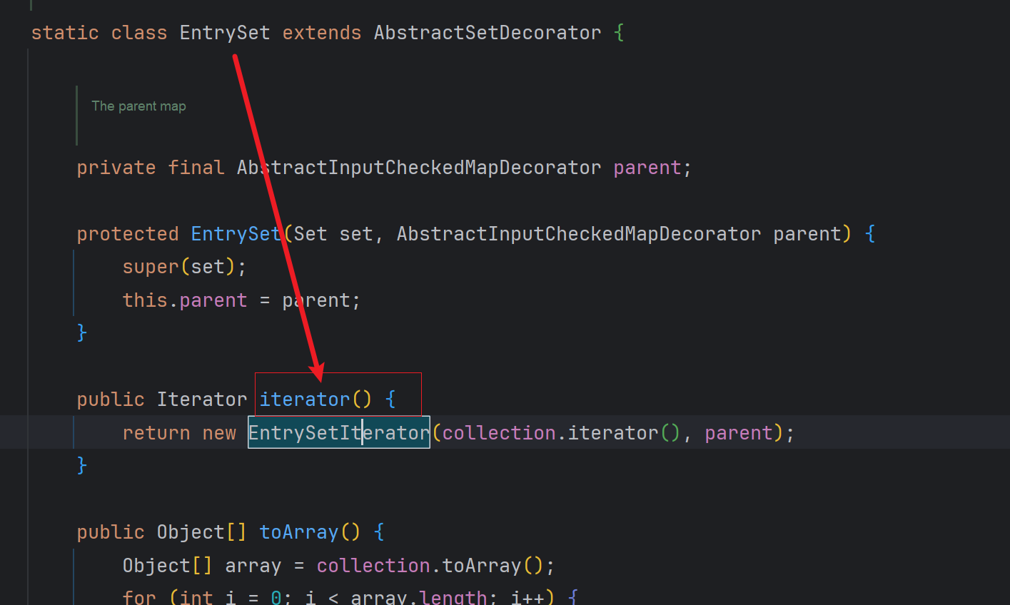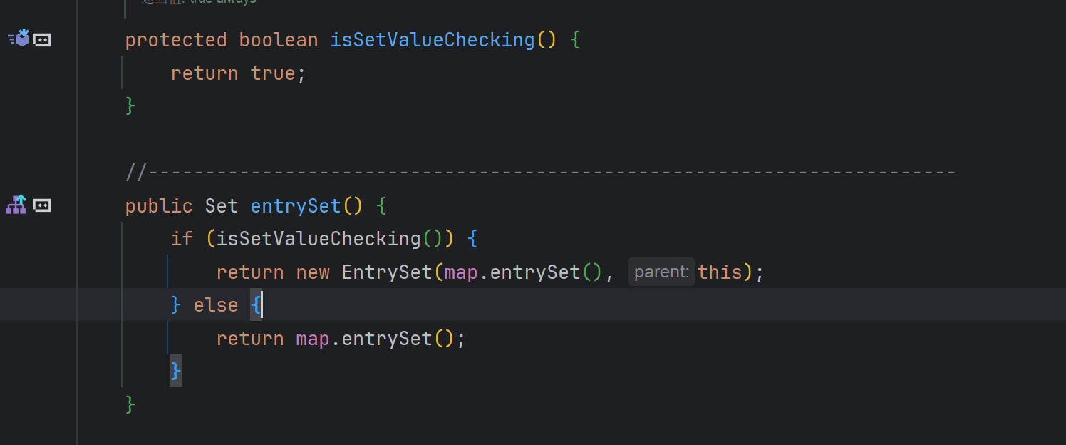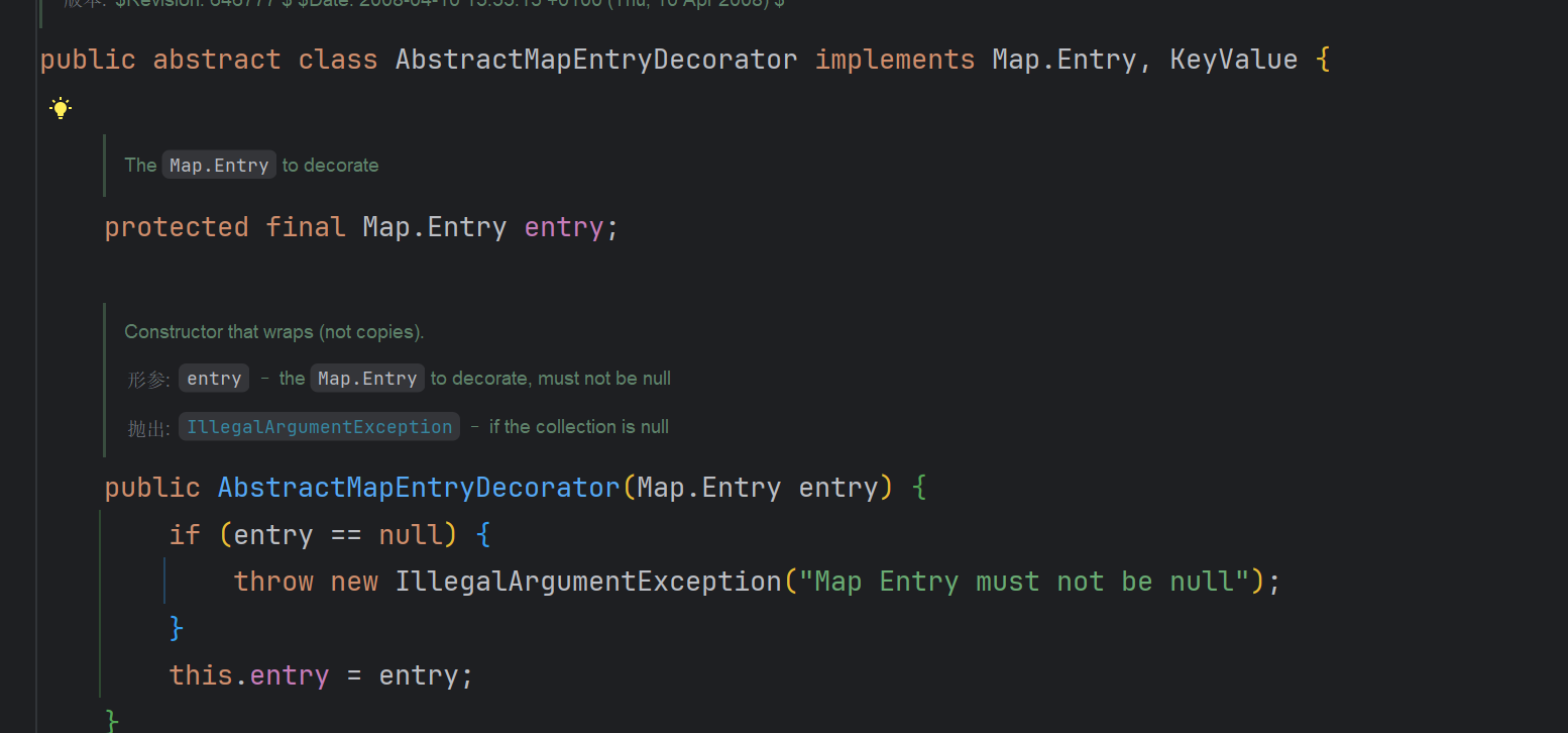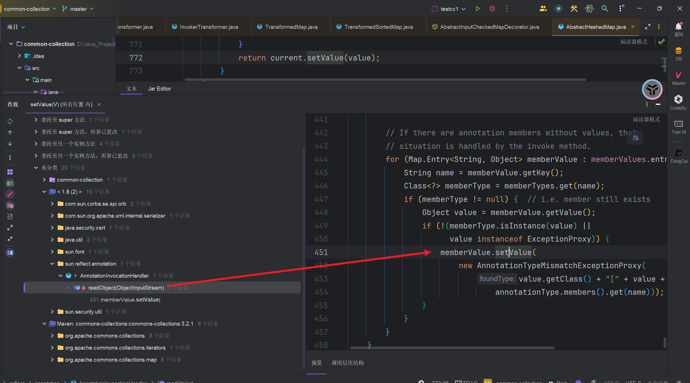 点击方法调用,发现setValue方法调用了checkSetValue()方法,setValue()方法是MapEntry这个类的(MapEntry 是内部静态类,重写了 setValue()),他在AbstractInputCheckedMapDecorator这个类中,而这个类正好是TransformedMap的父类