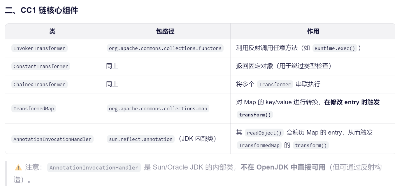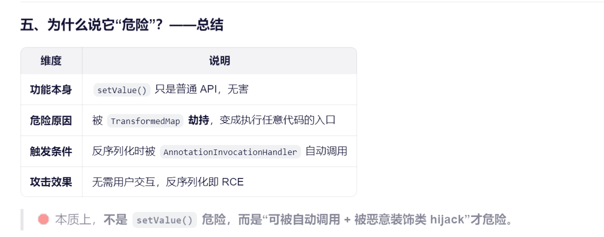 <font style="color:rgba(17, 17, 51, 0.5);background-color:rgba(175, 184, 193, 0.2);">transform()</font> 本身不会自动执行,必须由 **<font style="color:rgba(17, 17, 51, 0.5);background-color:rgba(175, 184, 193, 0.2);">LazyMap</font>** 或 **<font style="color:rgba(17, 17, 51, 0.5);background-color:rgba(175, 184, 193, 0.2);">TransformedMap</font>** 在特定操作时触发,而这些操作又被 **<font style="color:rgba(17, 17, 51, 0.5);background-color:rgba(175, 184, 193, 0.2);">AnnotationInvocationHandler.readObject()</font>** 自动调用。