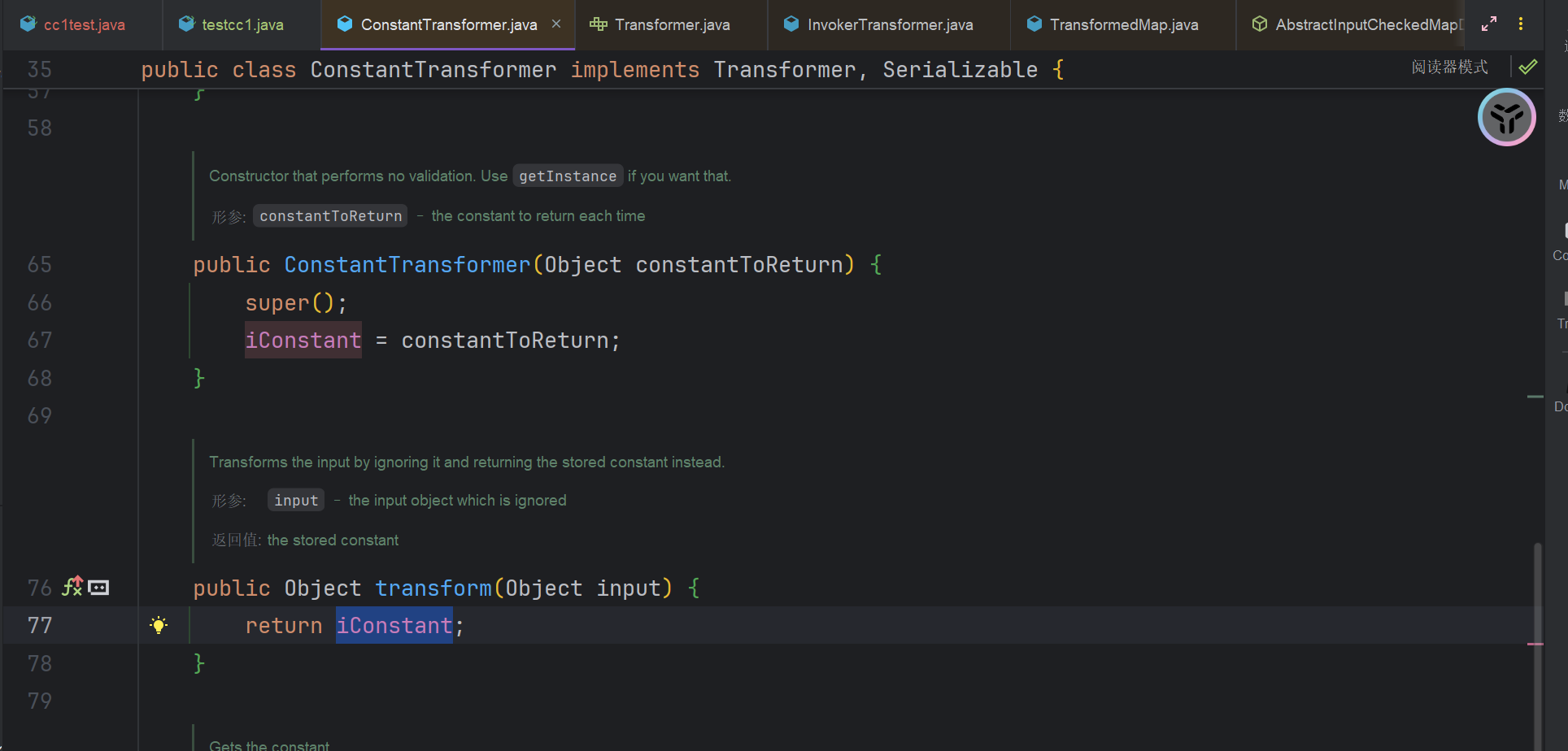 那么有没有一种transform不管输入什么都返回指定的内容呢?有的,就是ConstantTransform,我们可以看到ConstantTransformer.transform方法不管介绍什么都返回一个常量,而这个常量是他构造方法中我们可以输入的,所以这就解决了前面AnnotationInvocationHandler类的setValue方法我们控制不了的问题