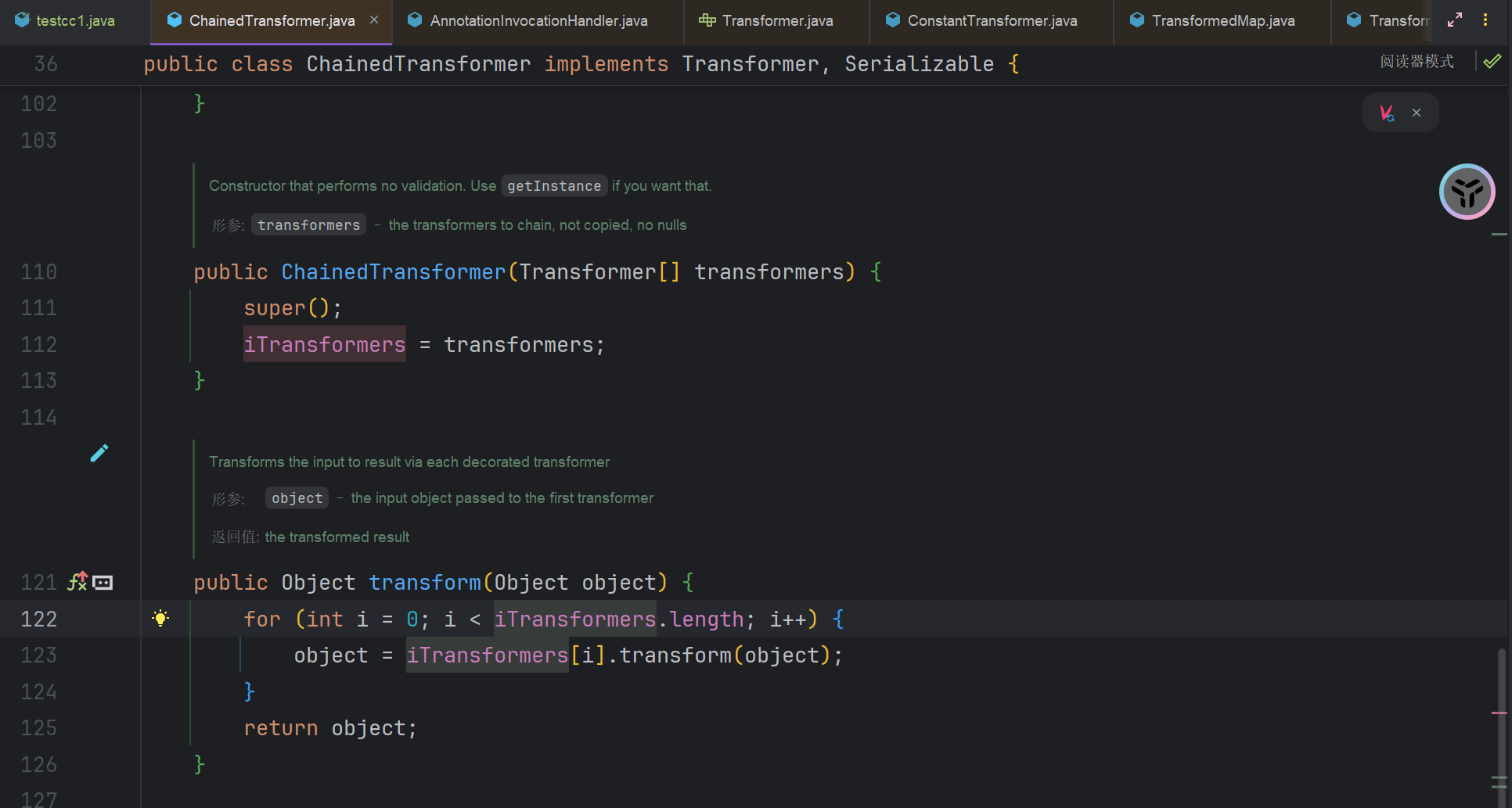 这个ChainedTransform类的transform方法的作用是:将输入对象依次通过多个 Transformer 处理,前一个的输出作为后一个的输入。