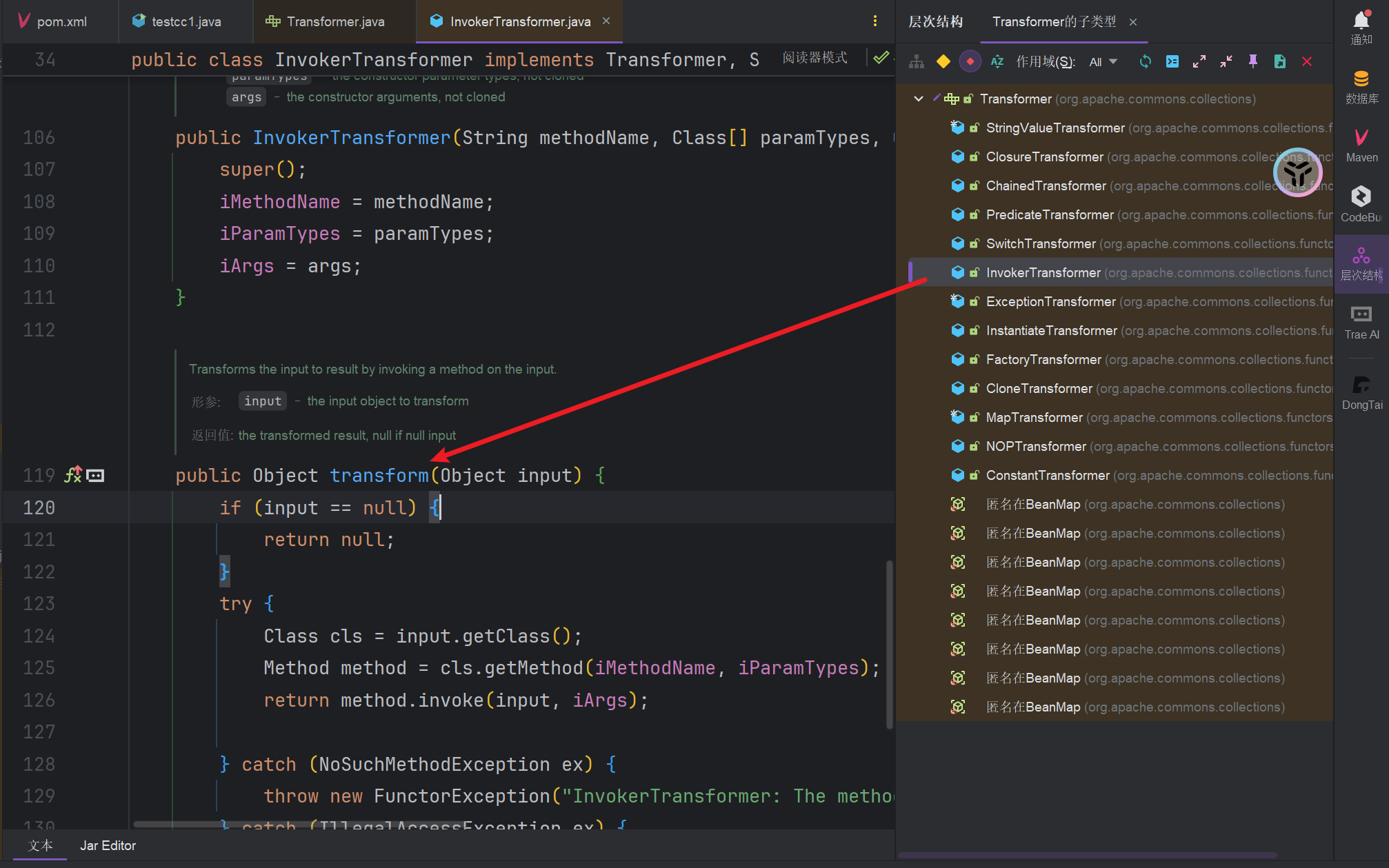 InvokerTransformer这个类实现了Transformer接口,并且InvokerTransformer类的transformer方法执行反射调用,他接收一个对象input,并通过反射查找传入对象的方法,并且调用该方法