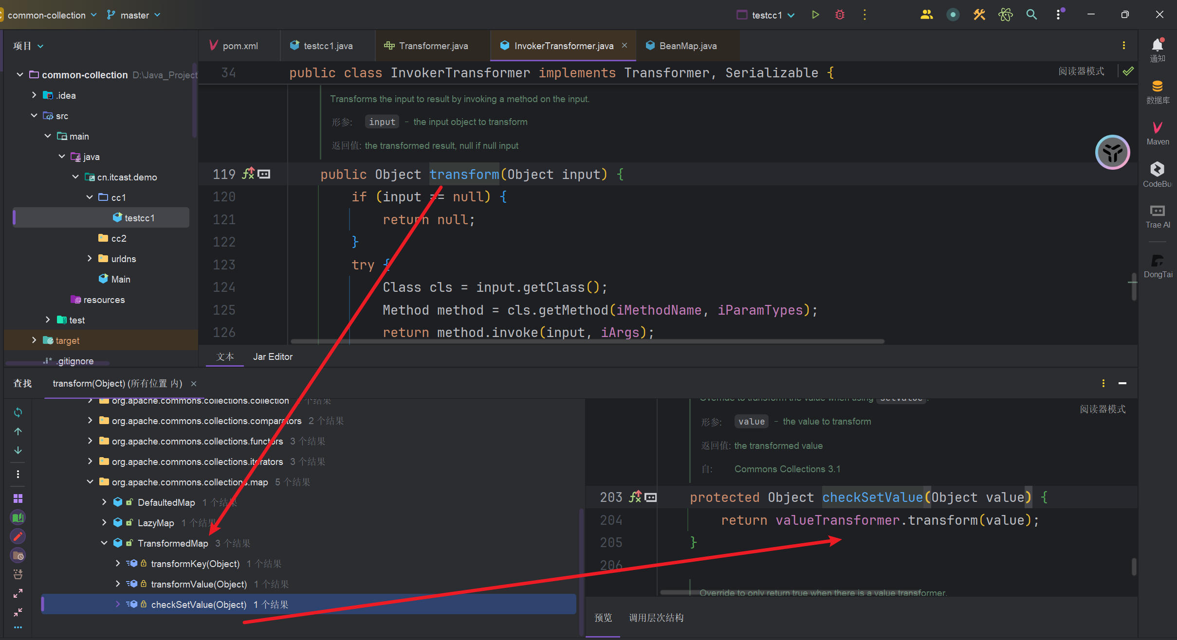 在此我们已经发现transform()方法是一个危险执行点,关键是我们要找到谁在反序列化时调用了它