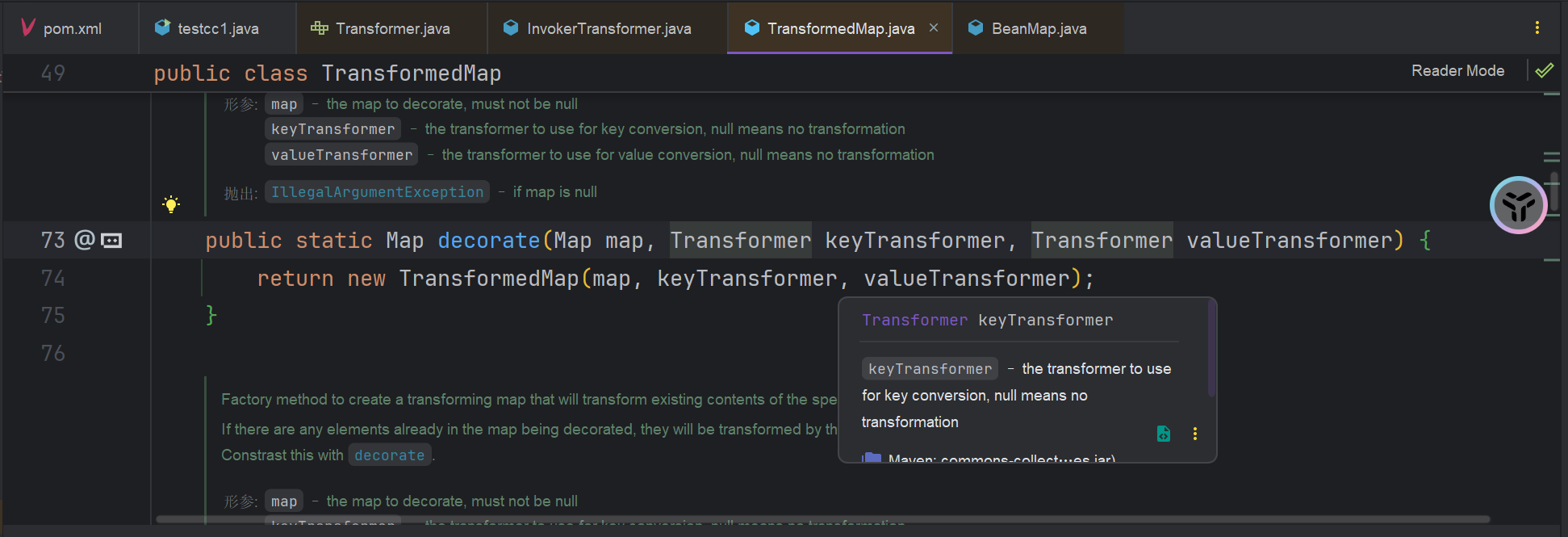 那就去看类的内部有什么方法调用TransformedMap方法,并且这个方法是public类型,也能传入valueTransformer,我们发现decorete()这个方法符合我们的要求