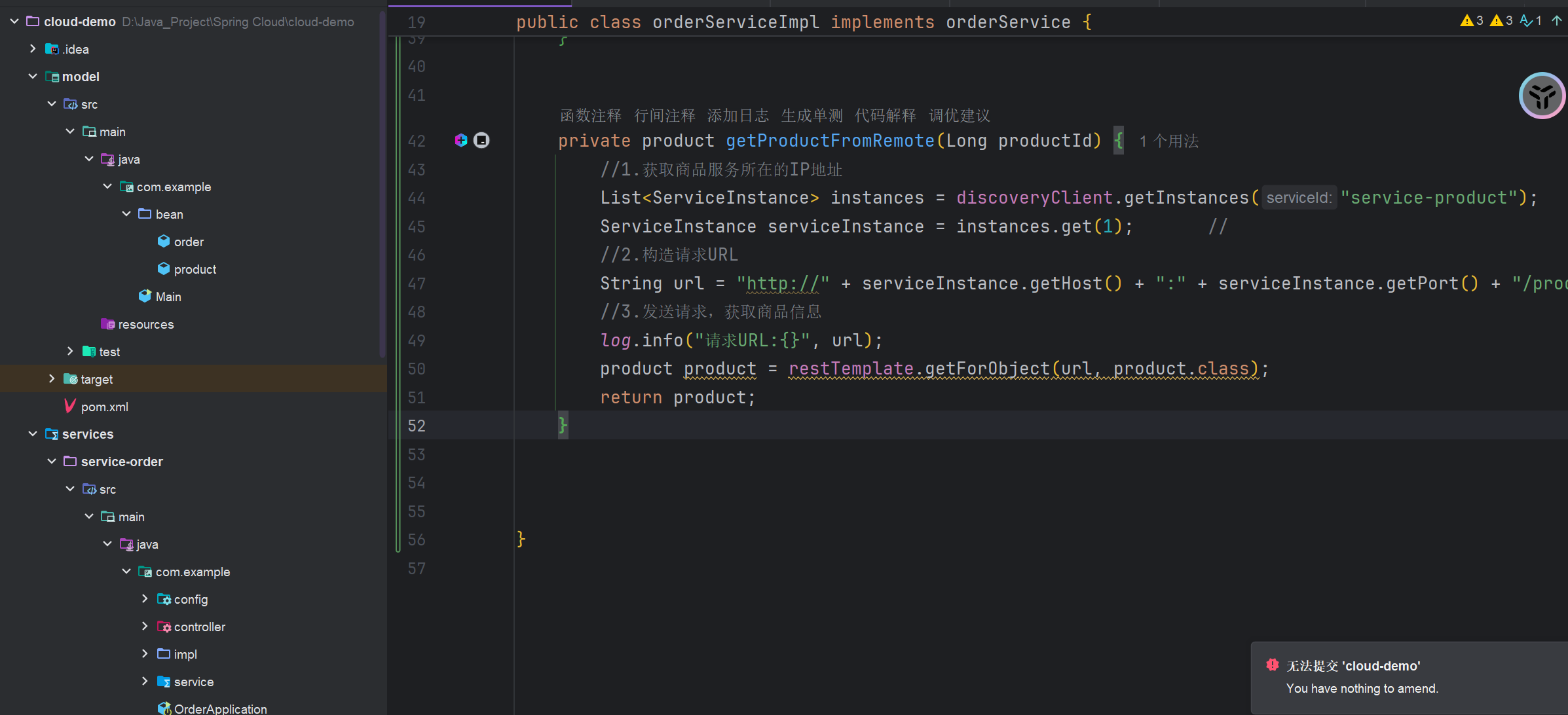 首先要定义两个微服务模块,分别是order模块和product模块,分别在这两个模块中编写对应的逻辑代码,这两个模块不需要写实体类pojo,将所有微服务的实体类抽取出来放到model模块统一管理