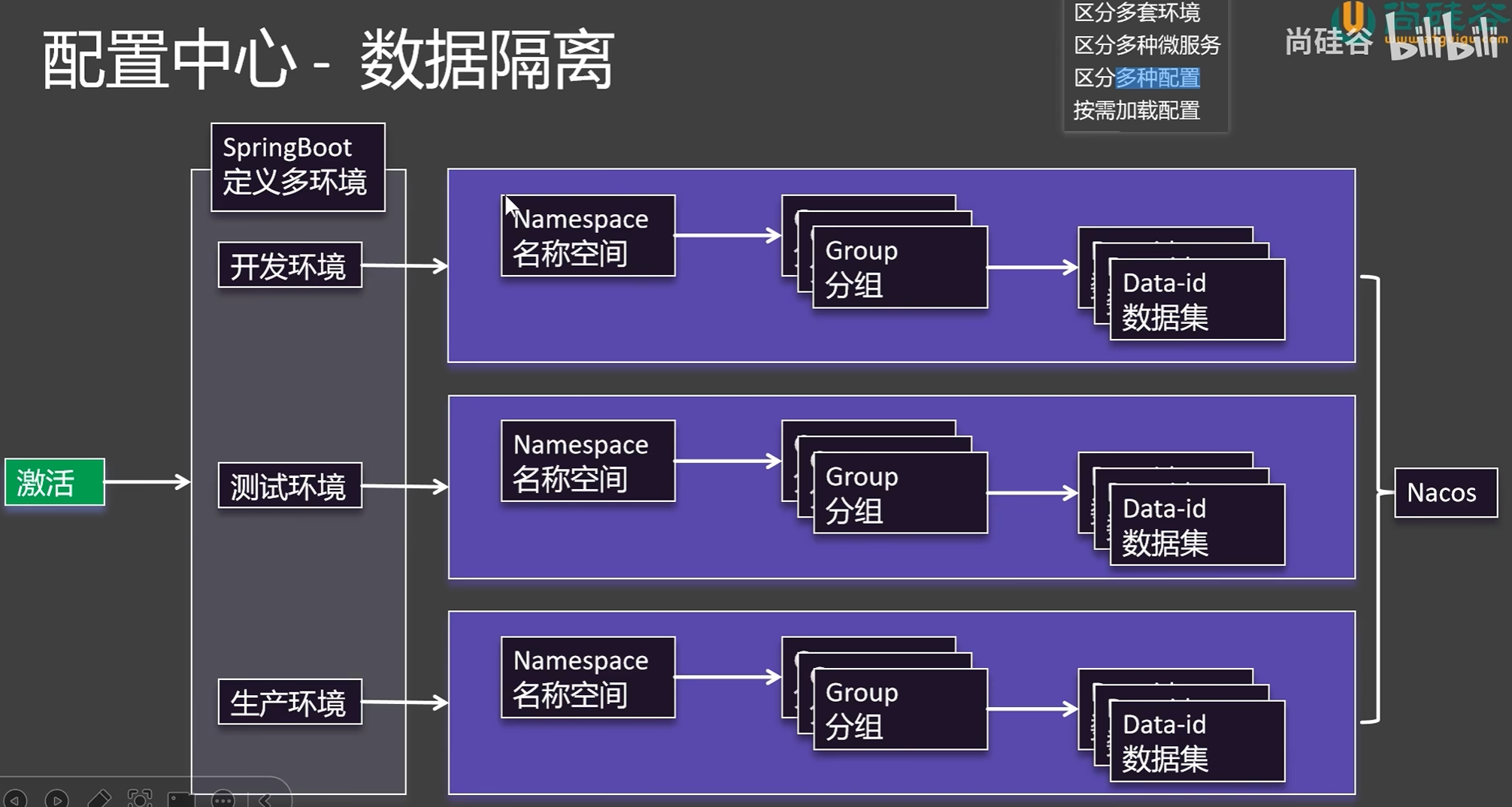 使用Namespace名称空间区分多套环境,使用Group分组区分多种微服务,使用Data-id数据集区分多种配置