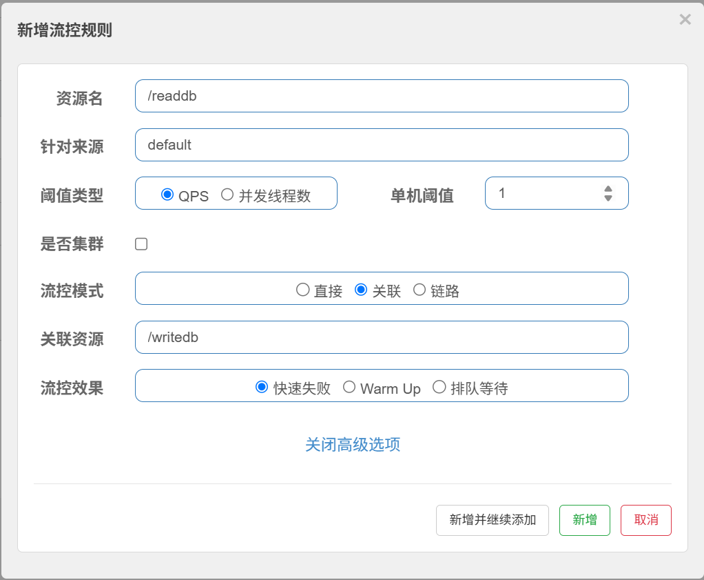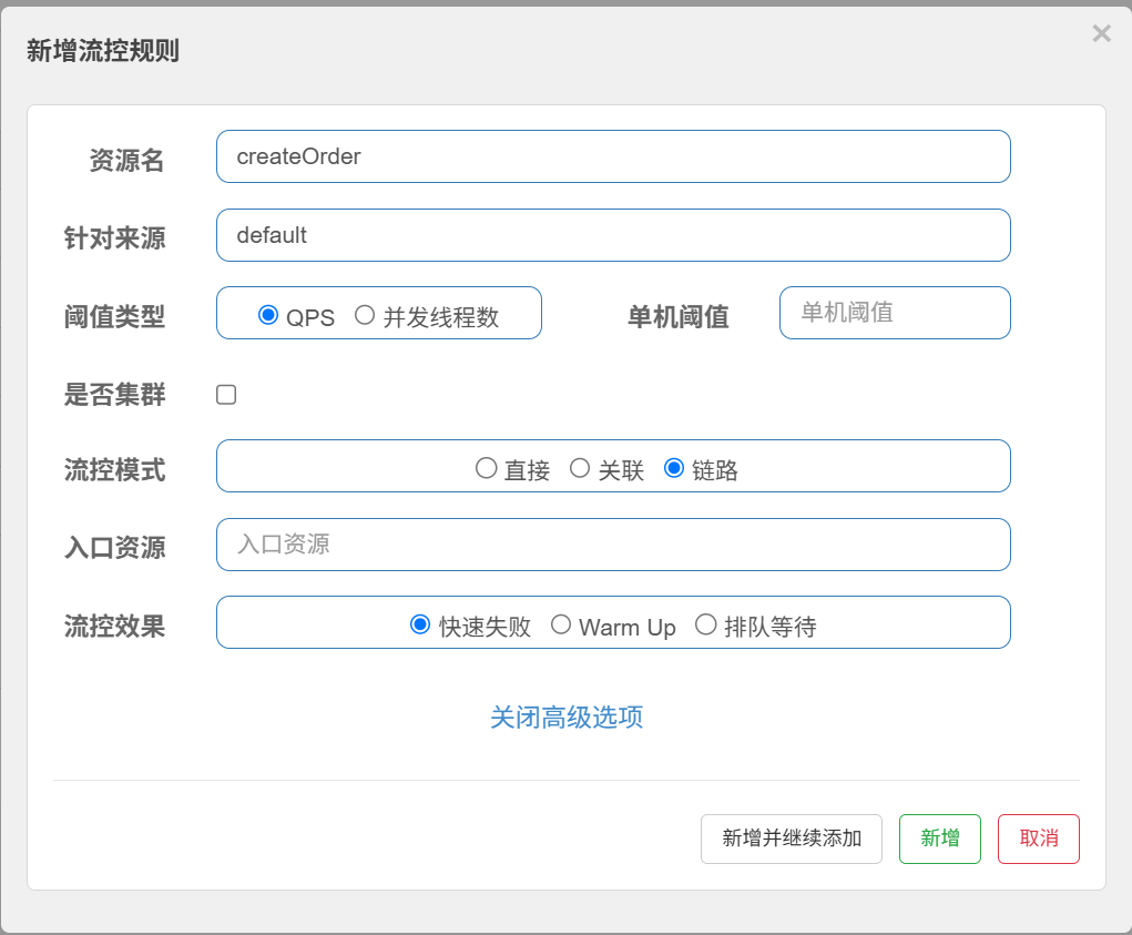 比如有这样一个场景:订单创建时分为普通创建订单和秒杀创建订单两种情况,我在createOrder资源中流控模式选择链路模式,入口资源选择秒杀创建订单资源名,那么当请求过快时,普通创建订单不受影响,秒杀创建订单会加载兜底数据