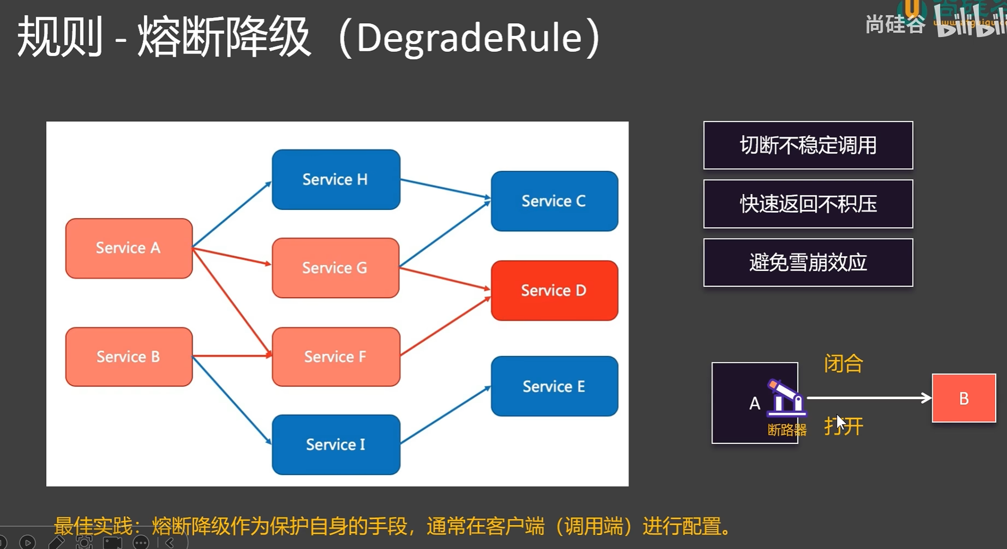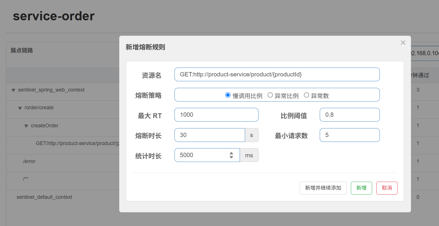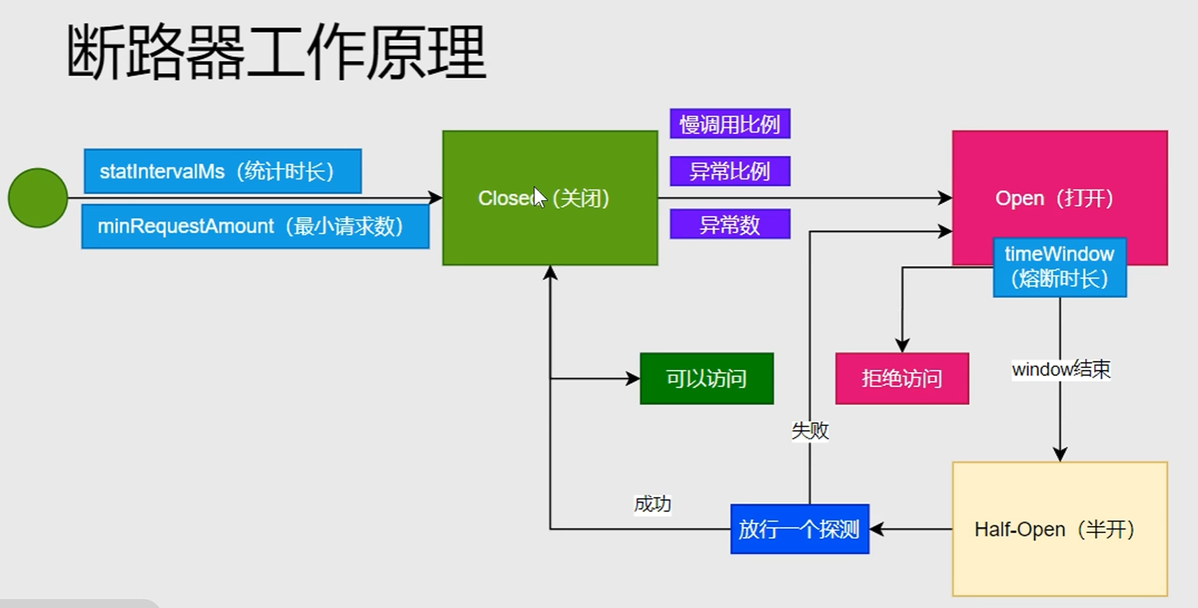 5秒内所有响应超过1秒的请求都为慢调用请求,如果慢调用请求超过总请求的80%,那么这个请求是不可靠的,那么断路器会熔断30S,这30S期间所有请求均返回错误