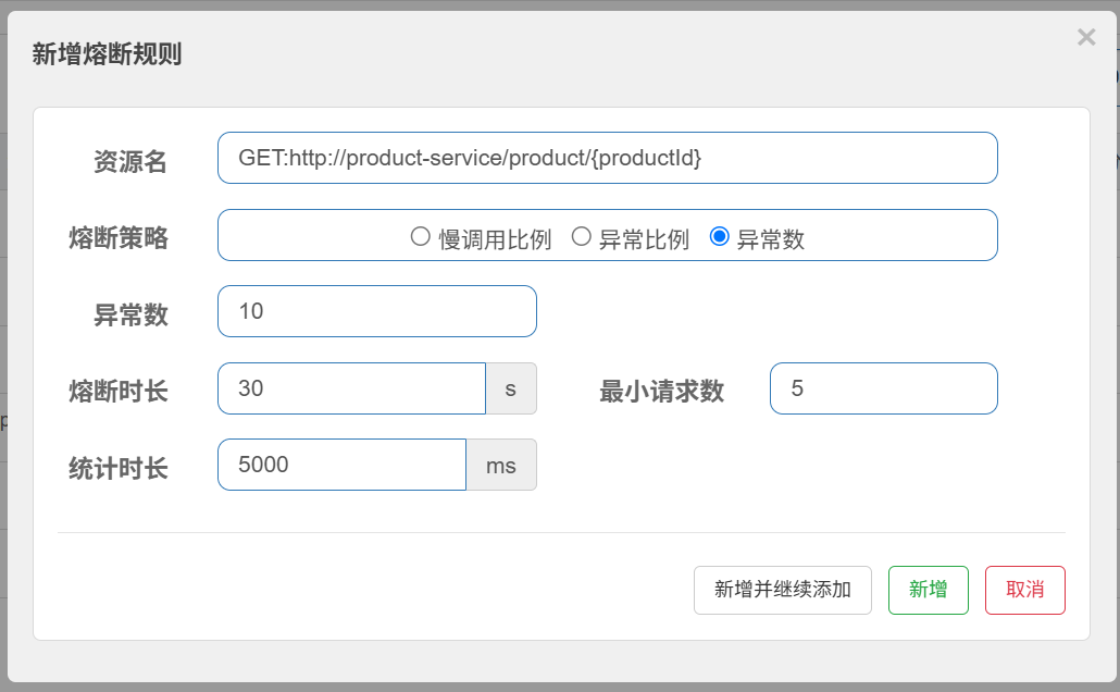 5秒内不管你发送多少请求,只要你请求中有10个存在异常,那么就直接触发熔断规则